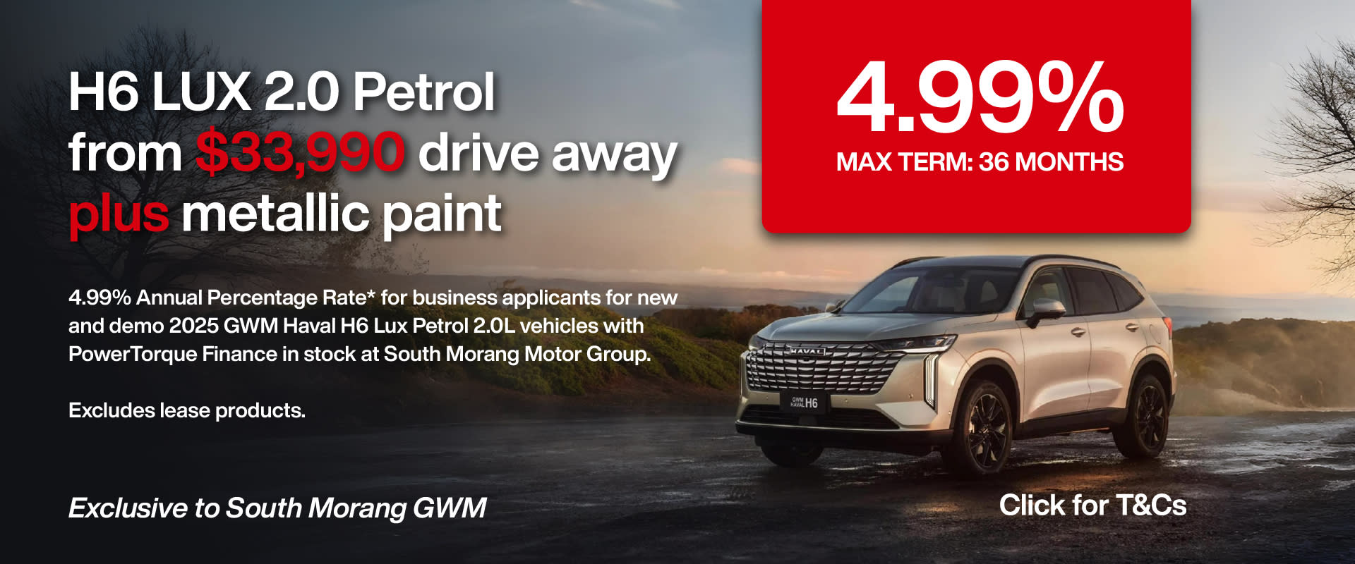 4.99% Annual Percentage Rate* for business applicants for new and demo 2025 GWM Haval H6 Lux Petrol 2.0L vehicles with PowerTorque Finance in stock at South Morang Motor Group. Excludes lease products. Max finance term 36 months.